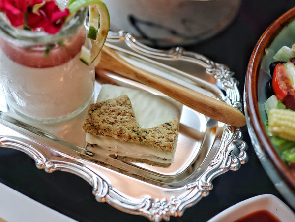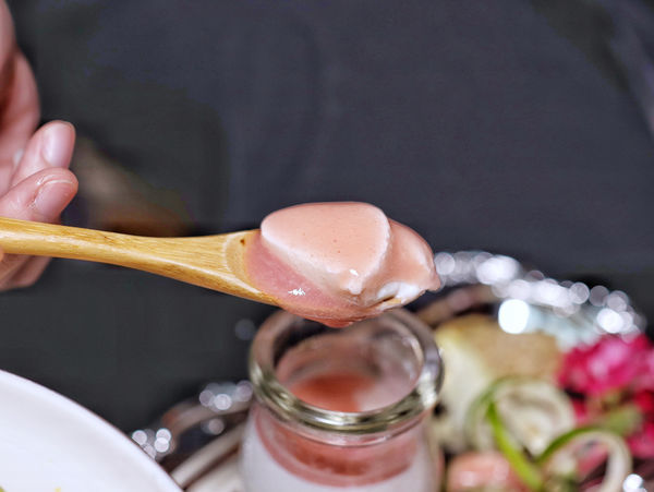 裝飾著食用花的奶酪滑嫩好入口,淋上些莓果醬更添風味,附加的方塊酥裹上白巧克力瞬間變成法式甜點,創意滿分!
