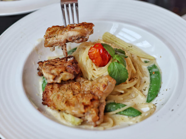 ▫️雞腿排義麵的白醬是以法國鮮奶油調製,香氣細膩,微微的甜味提升了奶香,溫柔依偎著鋼鐵直男麵條,神仙伴侶般的對味。