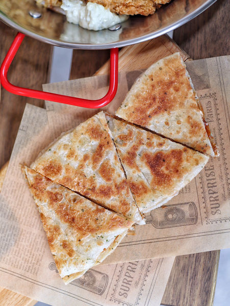 羅滴趴打裡面有蜂蜜芥末、塔塔、辣椒三種醬料,風味特殊,麵皮外酥、咬起來有些嚼勁,有點像南洋風味的蔥油餅,是外面我沒看過的餐點,吃得下的話推薦必點!