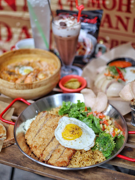 ▫號稱全球最好吃泡麵之一的Mi goreng印尼泡麵,想必大家多少都有吃過,口感Q,微甜微辣、香味濃郁好開胃,每一根麵條都巴滿調味料,暴風吸入最過癮!主食可以選擇炸豬排或炸雞腿,炸豬排有厚度、香酥不油膩,沾上塔塔醬更爽口,旁邊還有附上蔬菜跟半熟蛋喔!