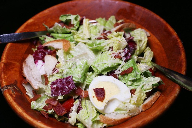 大木盆裝著蘿蔓生菜,搭配培根末、麵包丁、水煮蛋