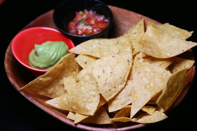 旁邊有烤餅跟沾醬(莎莎醬、酪梨醬、鹹豆泥、酸奶油)