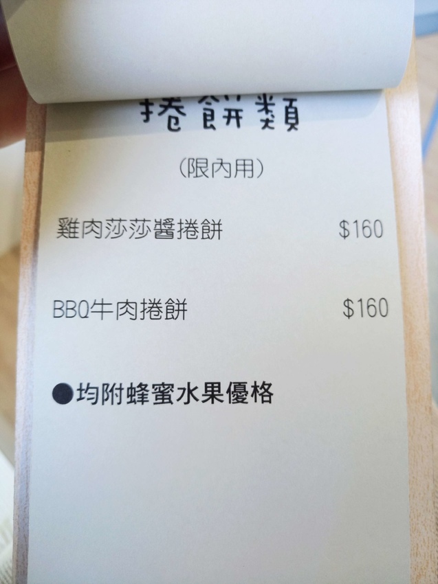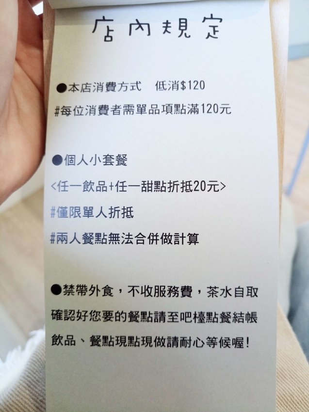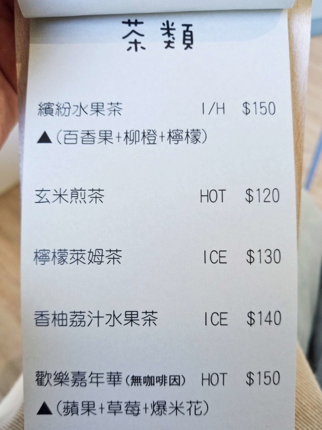 巧遇的低消為每人$120,飲品的部分有供應各式茶類、氣泡飲、鮮奶和咖啡,還有提供兩款鹹食捲餅。