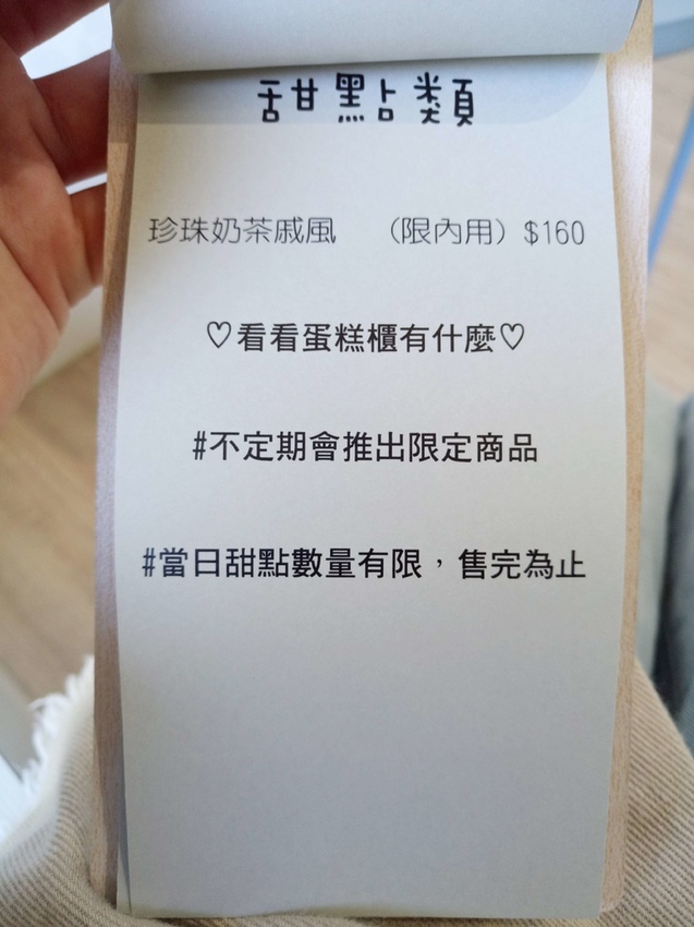 甜點除了珍珠奶茶戚風外其他品項皆不固定,不定期會推出季節限定的產品,可事先打電話私訊預留,或是到現場挑選自己喜歡的。