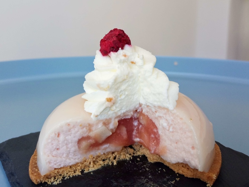 但其實這位「芭樂小公主」以紅心芭樂為主軸,從外層的紅心芭樂慕斯,到裡頭的芭樂醬、新鮮芭樂果肉,都滿溢著紅心芭樂的酸甜滋味,搭配底部的酥脆塔皮又是不同的口感,是道很適合少女的清爽甜點!