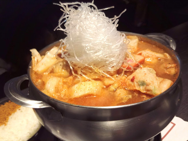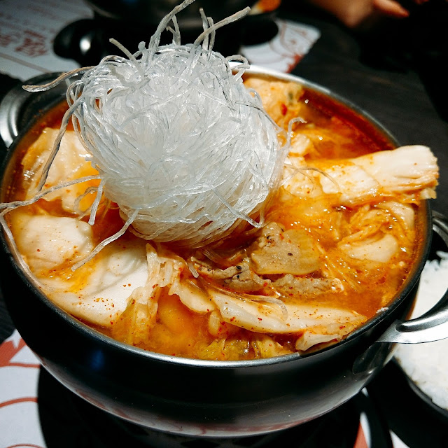 泡菜鍋看到的泡菜不是只有浮在上面的那些,鍋子底下整個被泡菜塞好塞滿呀!!(真的一定要很愛泡菜的人我才推薦他來吃,不然會跟我們一樣吃到很厭世,覺得~啊是還要吃多少泡菜啦XD)