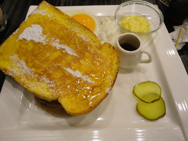 由於個人是吃「羅浮肉蛋布丁土司」,雖然有和朋友交換著吃,但兩片吐司都吃下後會覺得比較膩,此時旁邊的酸黃瓜就起了作用,剛好可以消除一些甜膩感。