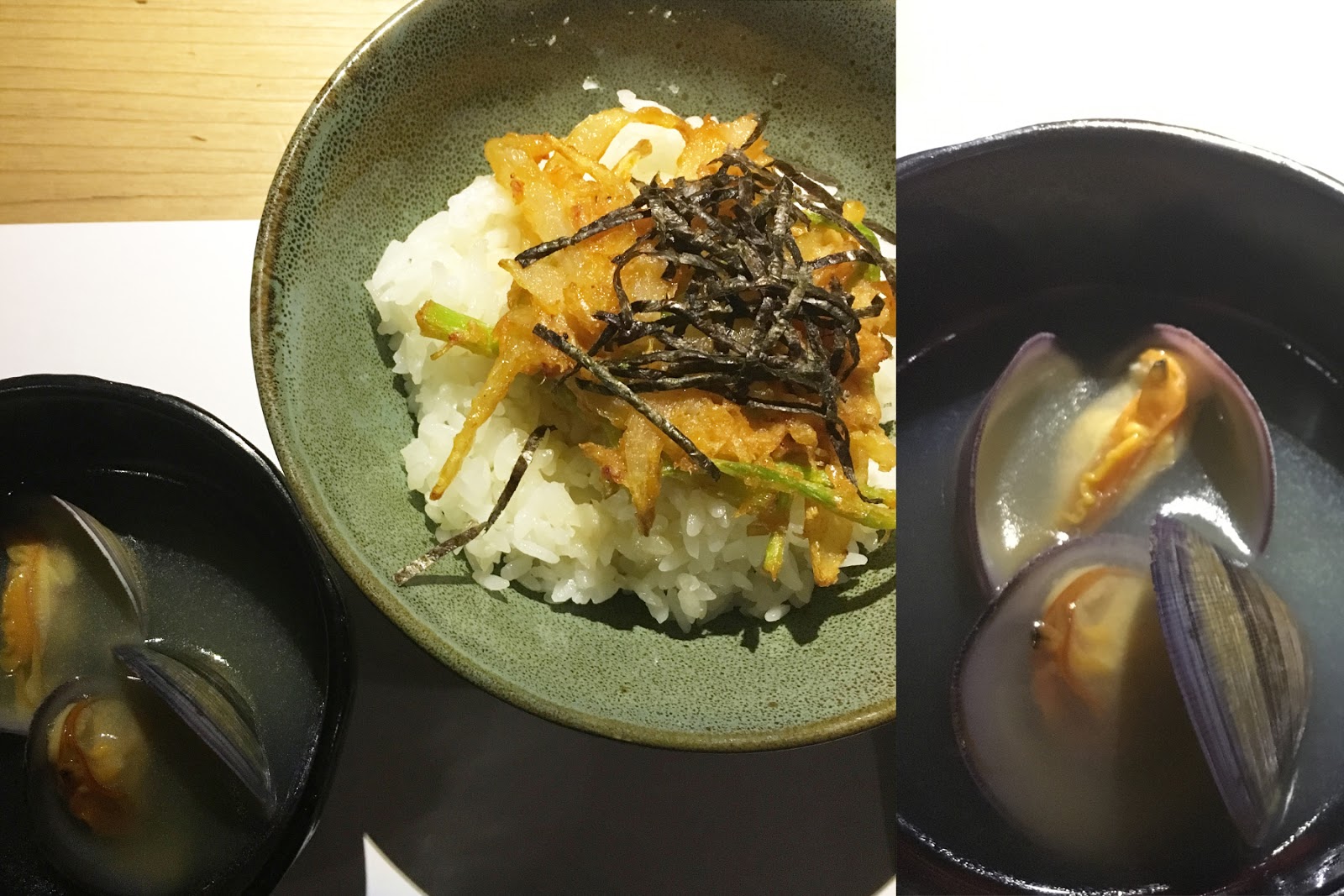 最後來碗綿密香氣花蓮吉安米煮成的白米飯,附上櫻花蝦炸成天婦羅,天婦羅醬汁攪拌著吃,整套餐吃到這裡,身為女孩子的我已經相當滿足了!搭上一碗花蛤煮成的湯品,味道跟前面的煮物很類似,溫暖的湯底一樣很驚艷!