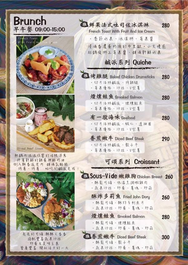 Menu內涵蓋早午餐、漢堡、義大利麵、莊園排餐