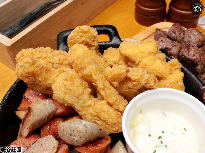 如果人多來到「暖谷莊園」這邊聚餐,可以點些炸物一起吃,像是「肉食控大拼盤」裡面包含了暖谷莊園菜色中很推薦的德式炸豬腳及招牌骰子牛肉,一口氣能吃到五種不同肉品,真的很適合肉肉控們點來一起分享。
