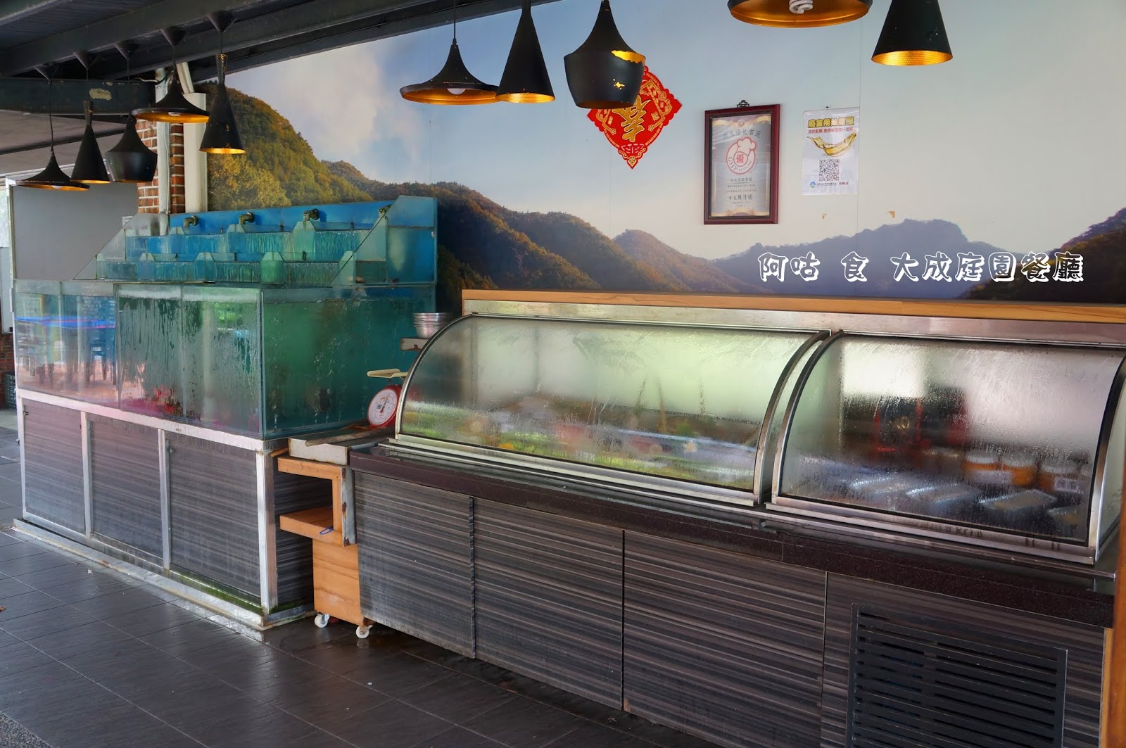 通廊一隅是存放活體海鮮食材的水族箱與食材冰櫃。