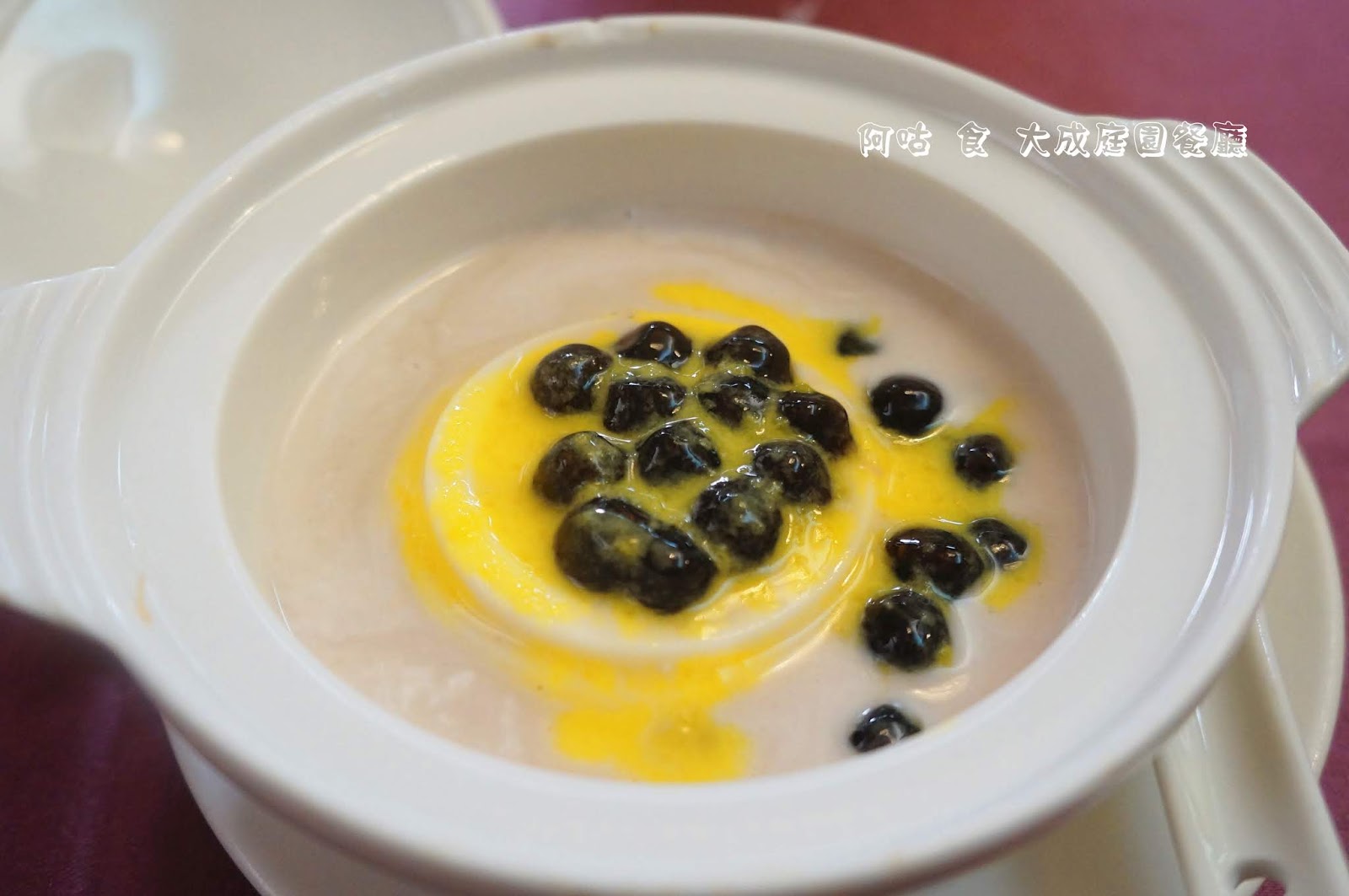 甜點為芒果珍珠露,奶酪浸在帶有芋頭香氣的甜湯中,上頭覆以芒果醬與若干珍珠,風味與口感都有豐富的層次感。