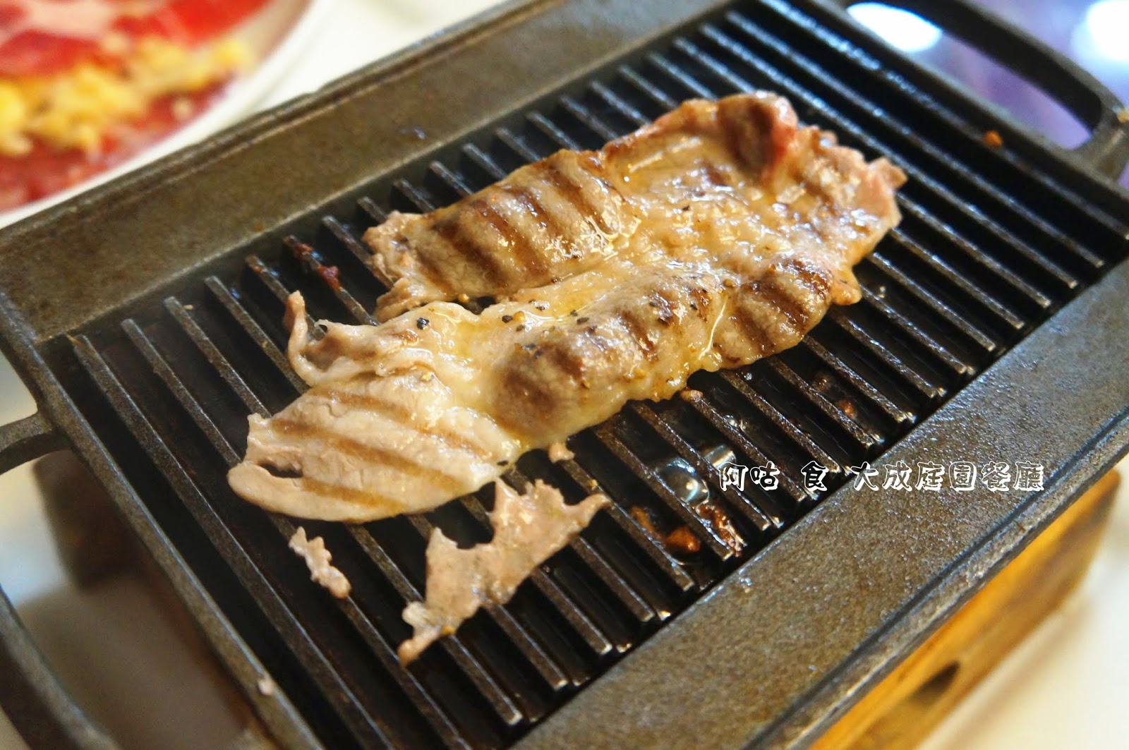 綿羊豬肉已作薄切處理,放在烤盤上滋滋作響,油香隨著升起的白煙撲鼻而來。