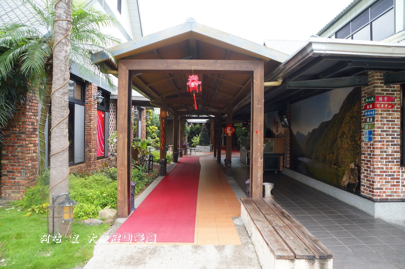 通廊旁的紅磚柱上有各用餐空間與洗手間的方向指示。
