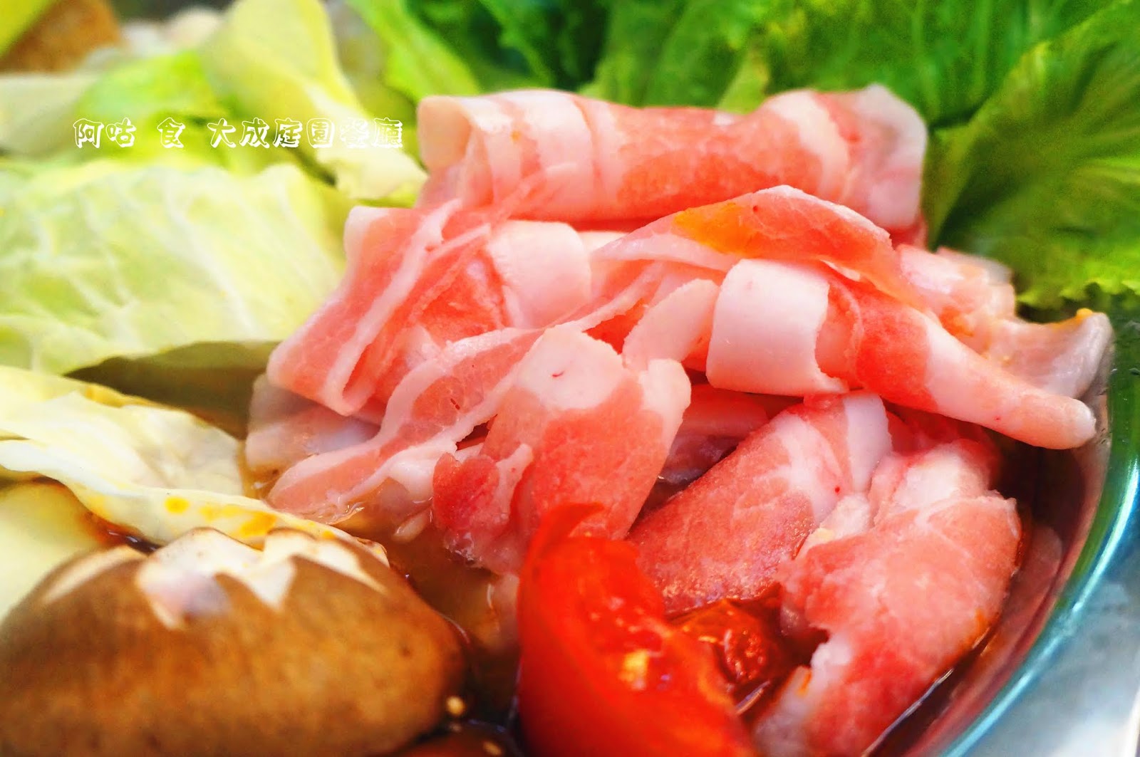 隨鍋附上一份菜盤,內容有分量不少的豬肉、菇類、葉菜類、筊白筍、花枝丸與豆皮等。