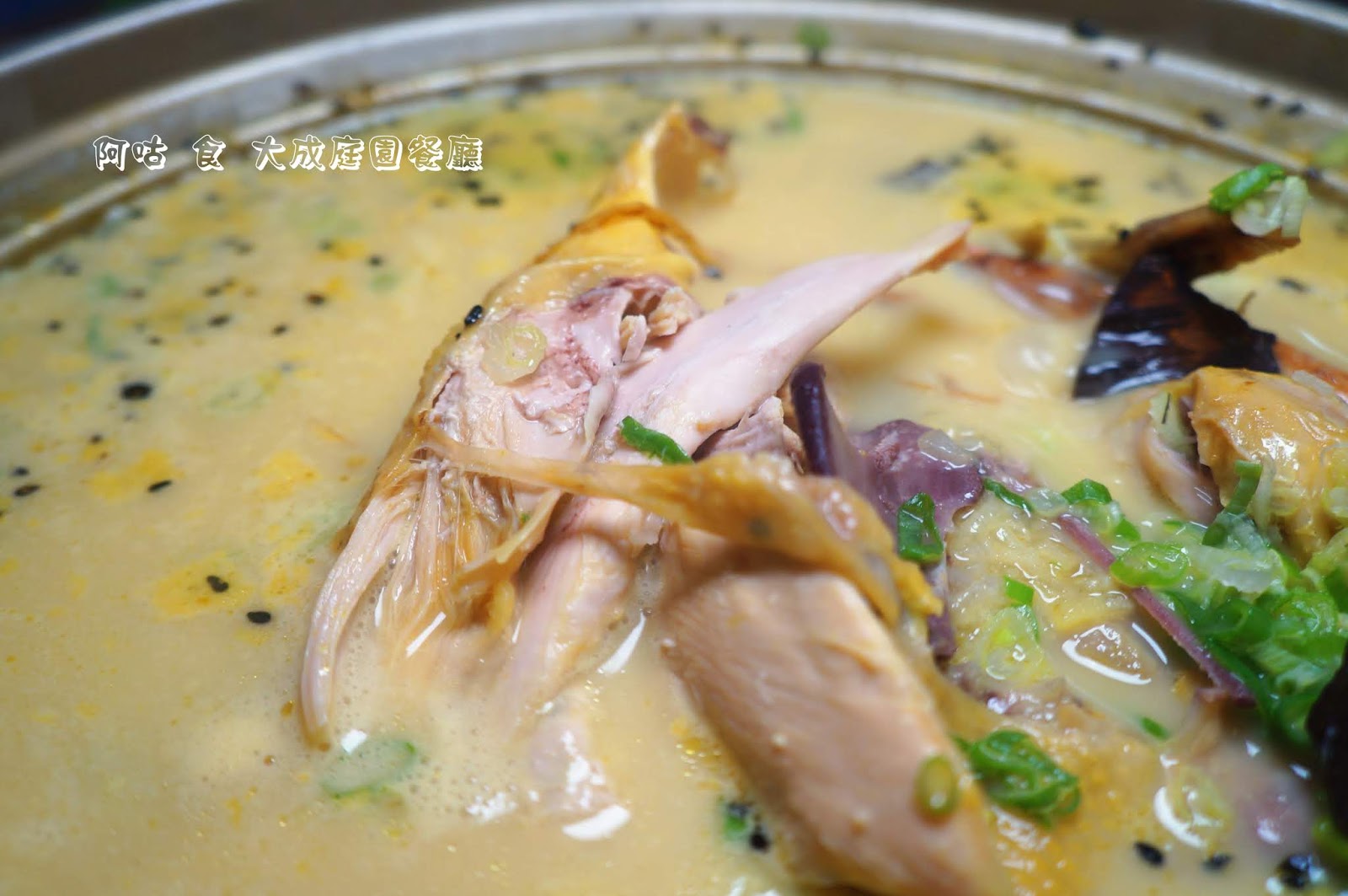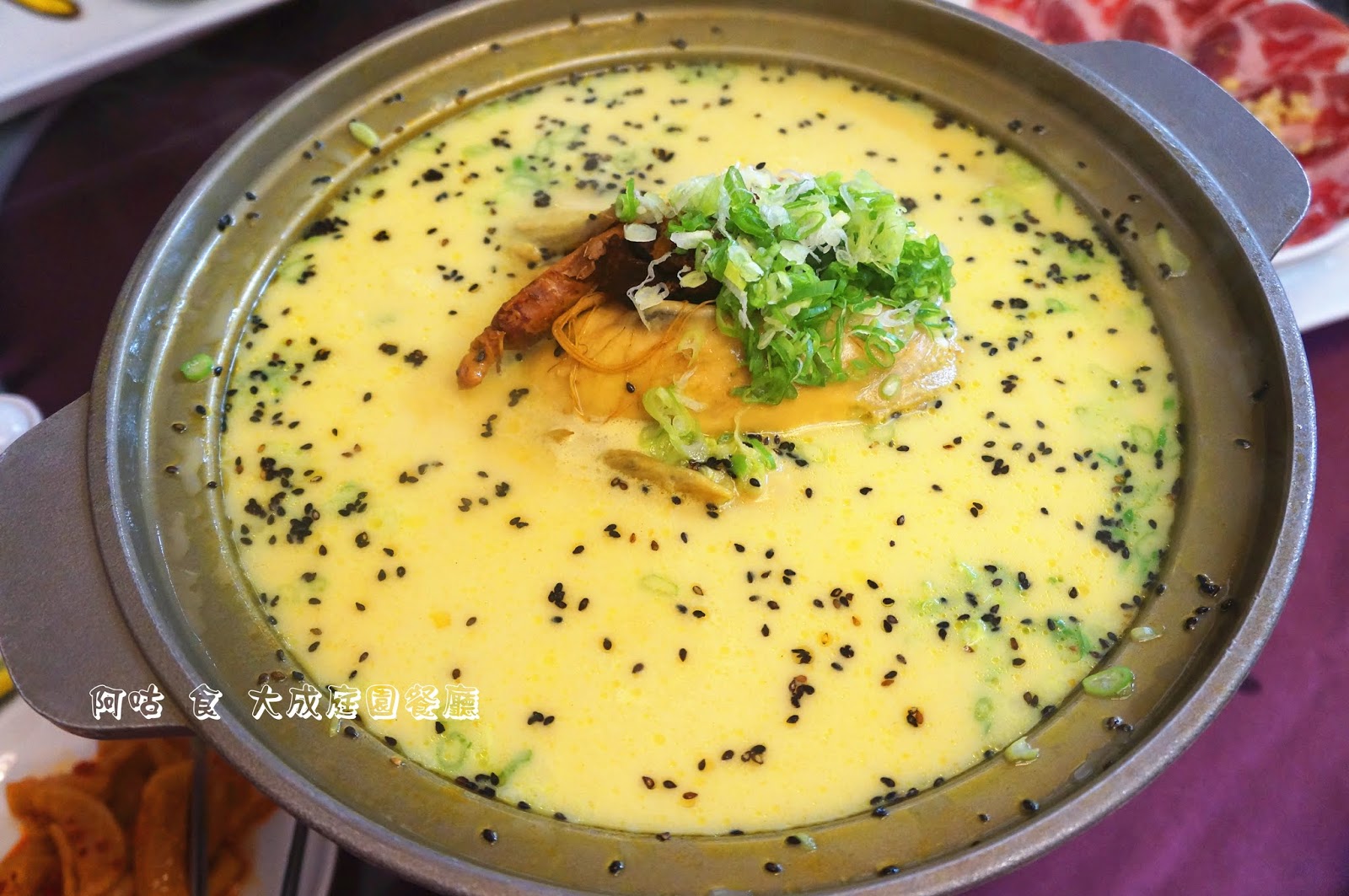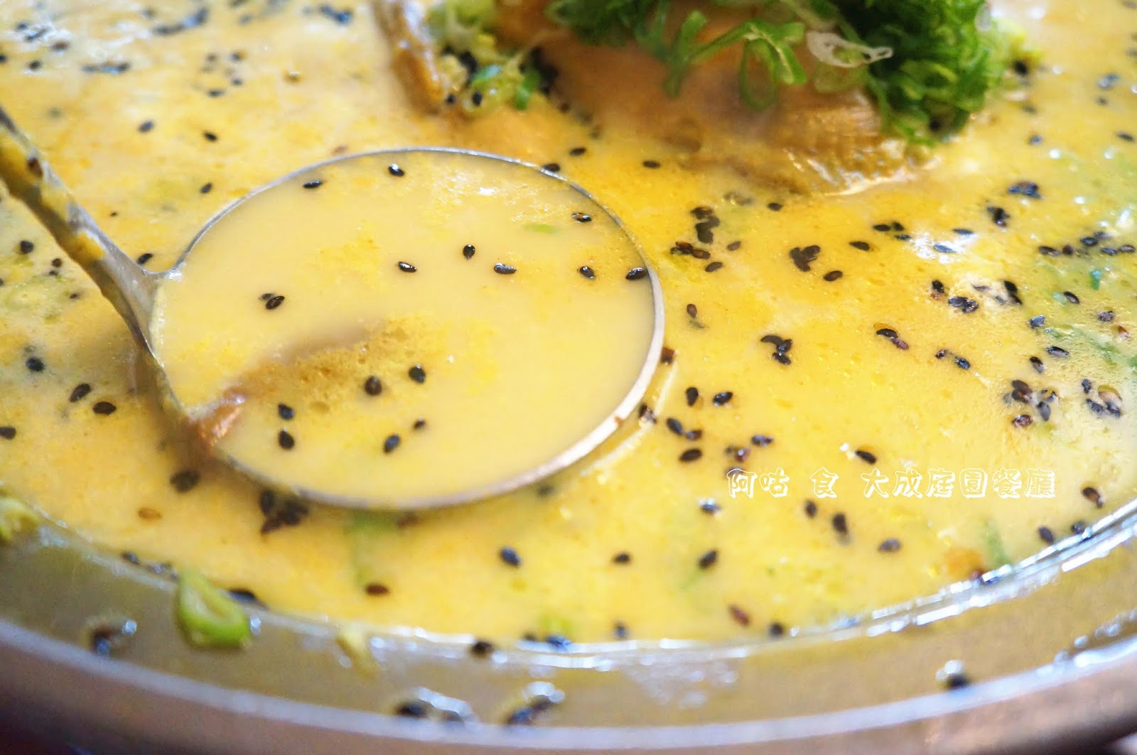 其乳黃色的湯頭乍看之下有點像泰式咖哩,湯面上浮著不少黑芝麻,中間是糯米雞。