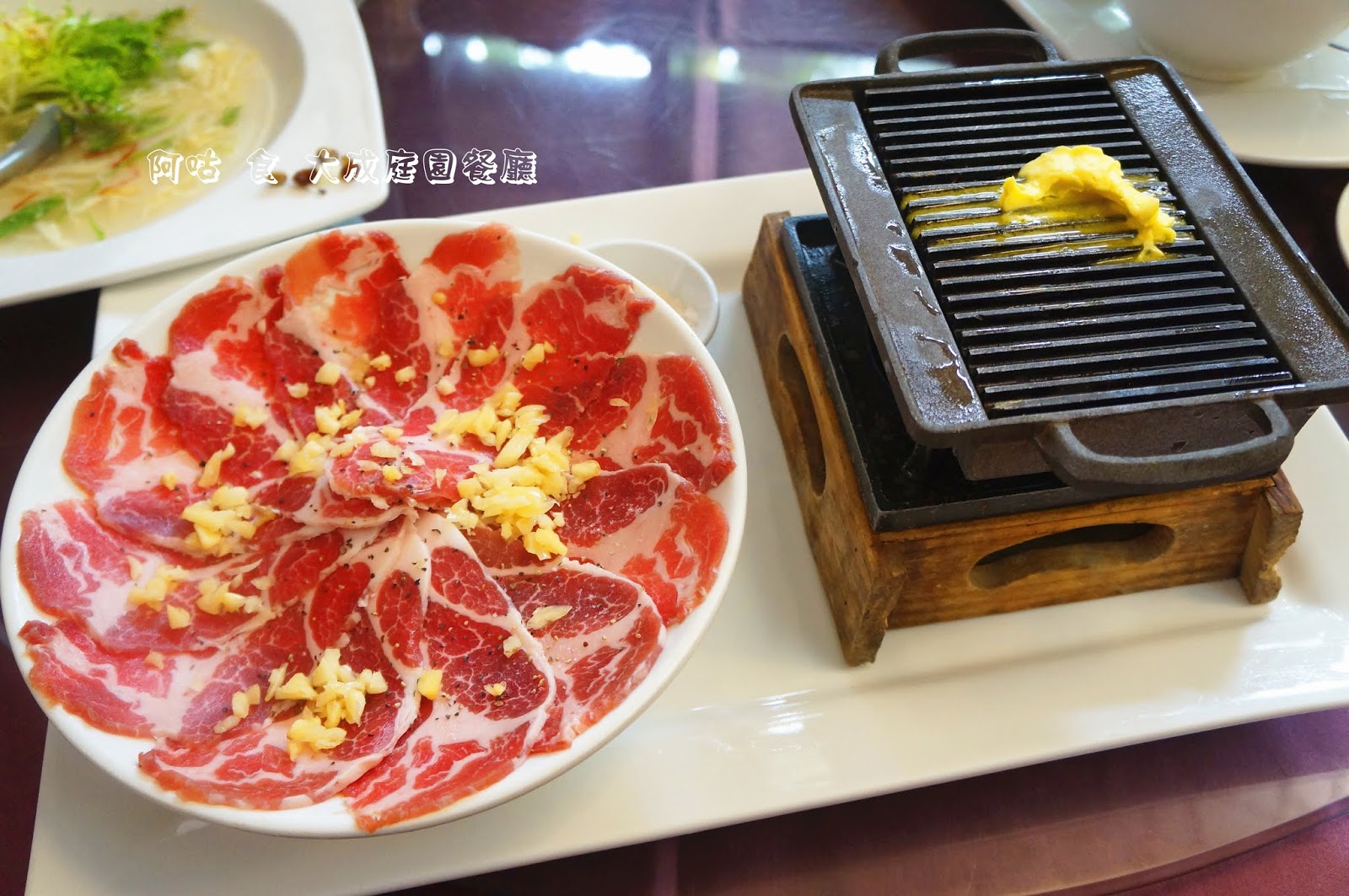 這道料理可享受自行煎烤的樂趣,內容包含了一盤綿羊豬肉切片、煎烤鐵板、玫瑰鹽與塗抹鐵板用的奶油。