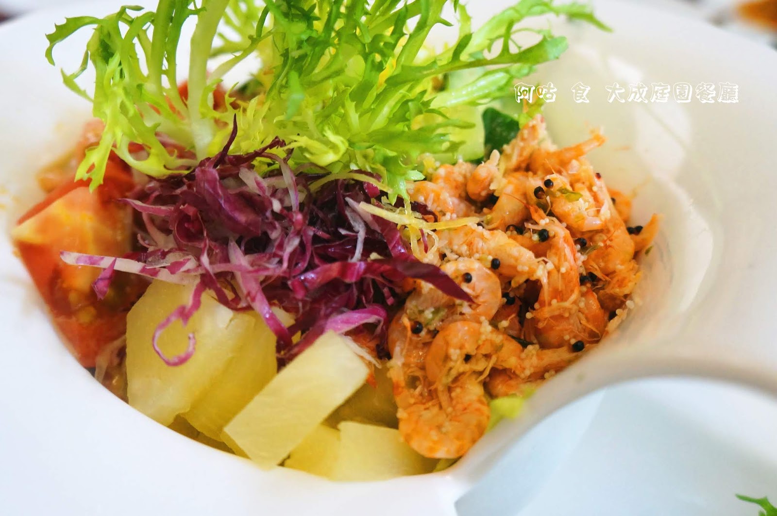 生菜沙拉中不僅有多樣果菜,還放了分量不少的甜蝦,甜中帶鹹的甜蝦還附有些許蝦卵增加咀嚼時的口感。