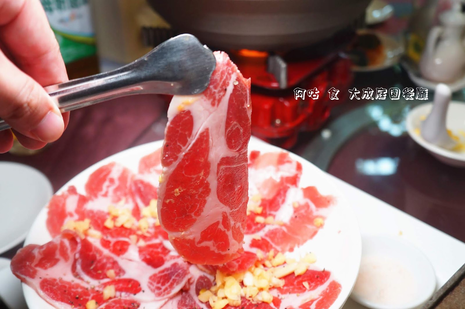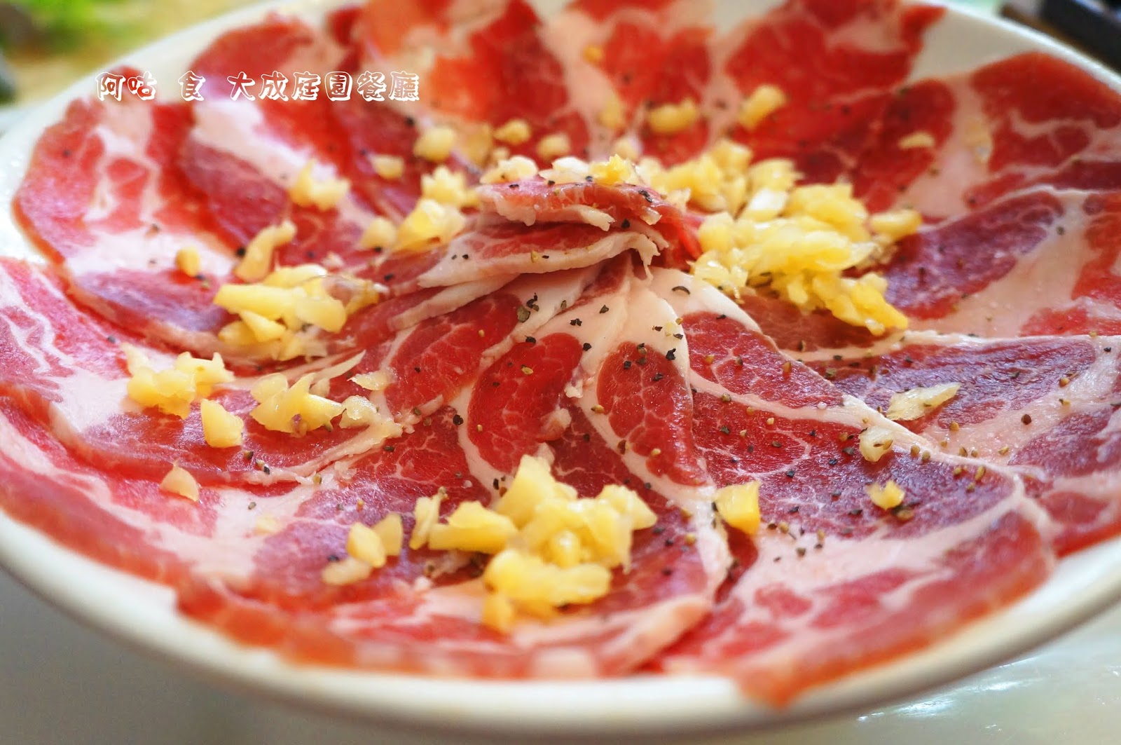 綿羊豬肉呈現很漂亮的鮮紅色,油花也分布得很均勻,並撒上了適量的黑胡椒與蒜頭。