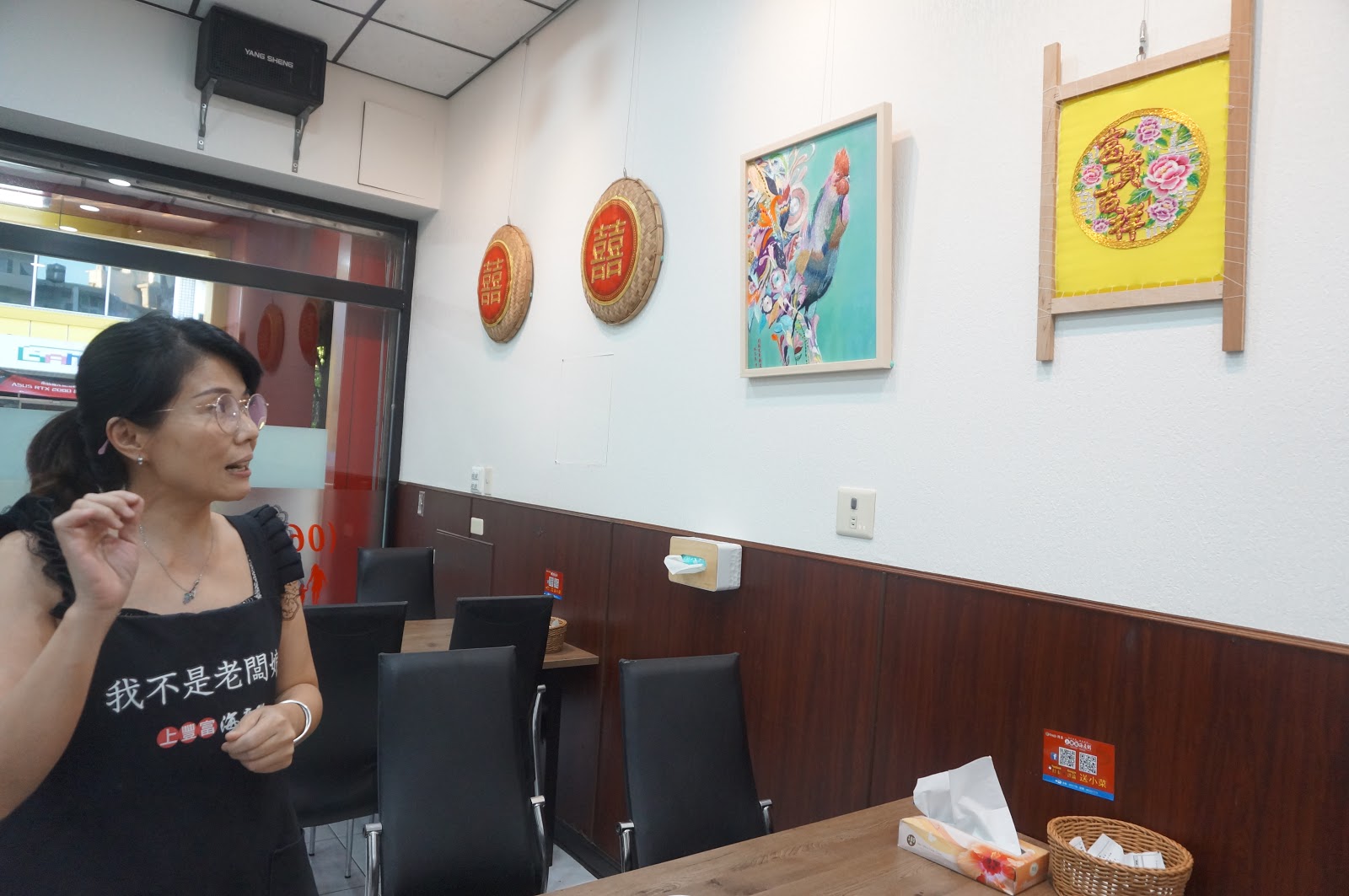 一進到上豐富海產粥,映入眼簾的是府城光彩繡莊的刺繡藝術品,滿滿的刺繡作品,要價4萬至10幾萬不等。