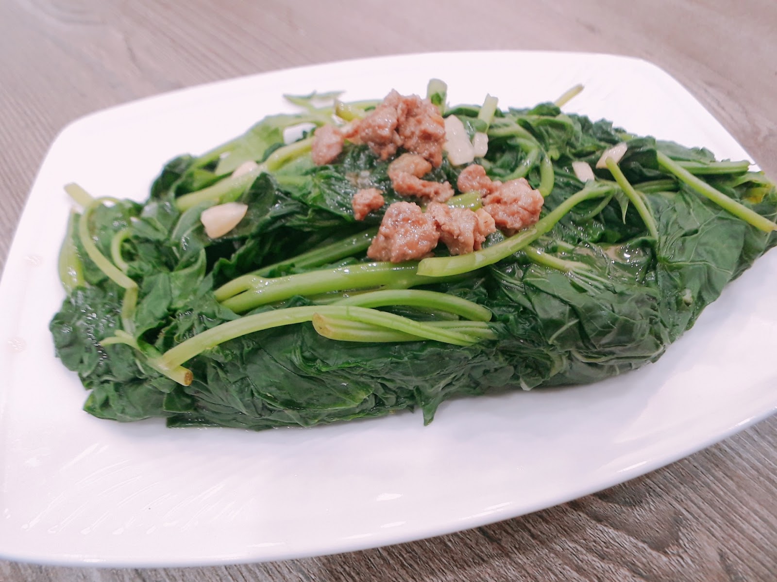 蔬食燙青菜40元,上豐富海產粥的燙青菜是以食令的季節菜為主,屎蛋媽今天吃到的是地瓜葉,上豐富海產粥的地瓜葉好嫩喔!連挑嘴的屎蛋也愛吃!淋上上豐富海產粥的手工肉燥,好對味!