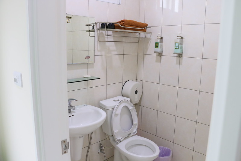 廁所乾淨明亮,提供毛巾、洗髮精與沐浴精