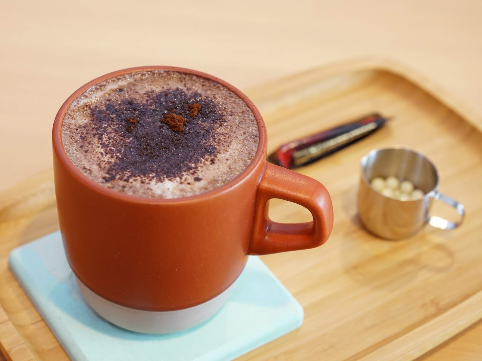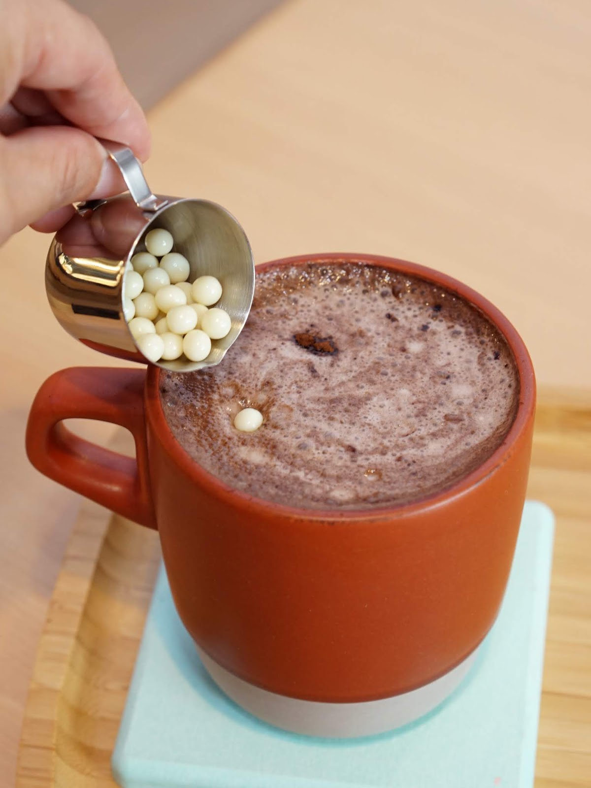 喝之前可以再加入法芙娜巧克力棒與白巧克力豆,先加入巧克力棒攪拌一下,然後加入巧克力豆,讓口感更加豐富。