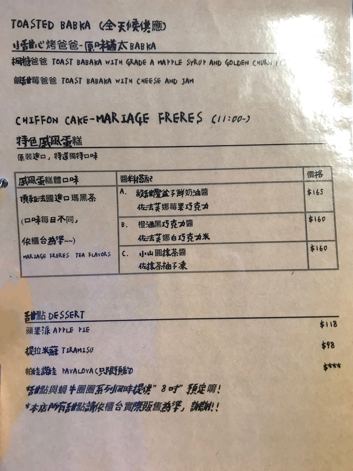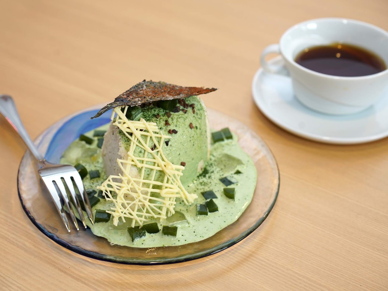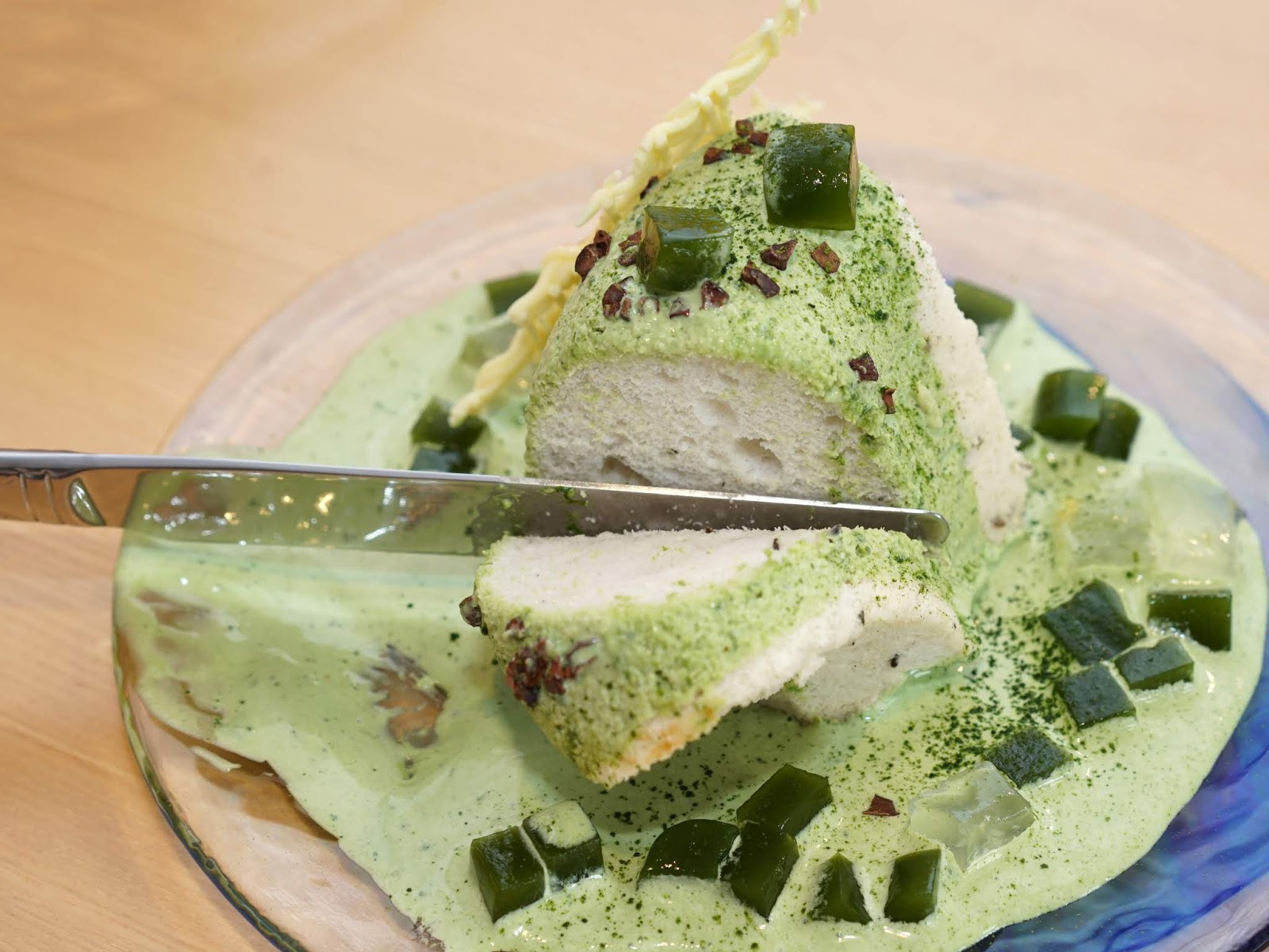 另外還有最新推出的特色戚風蛋糕,以頂級法國瑪黑茶做的戚風蛋糕,並淋上特製的醬汁與配料,這款夏天最受歡迎的小山圓抹茶口味,也是我的最愛,上面還有一片特製的海苔與白巧克力做成的裝飾。