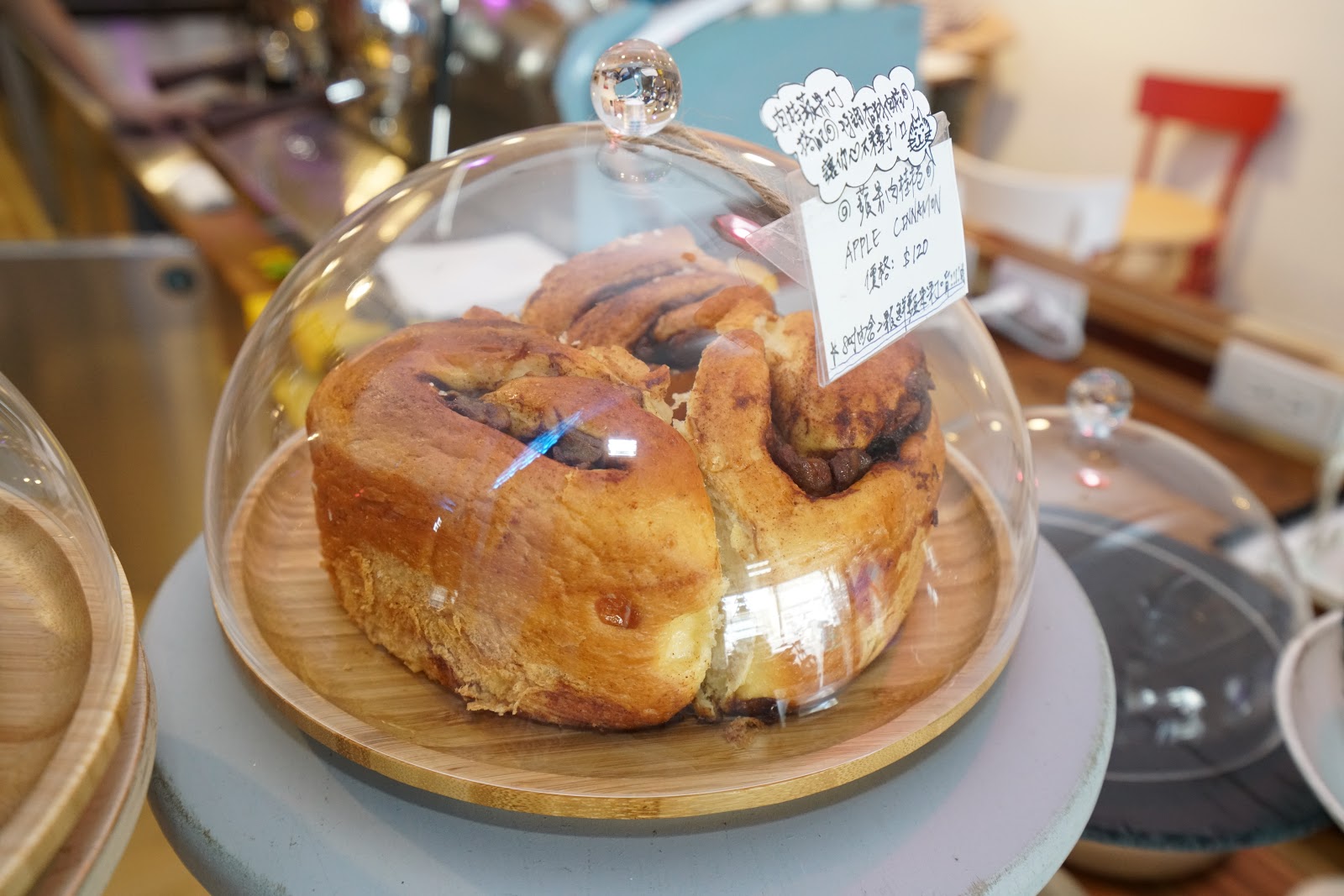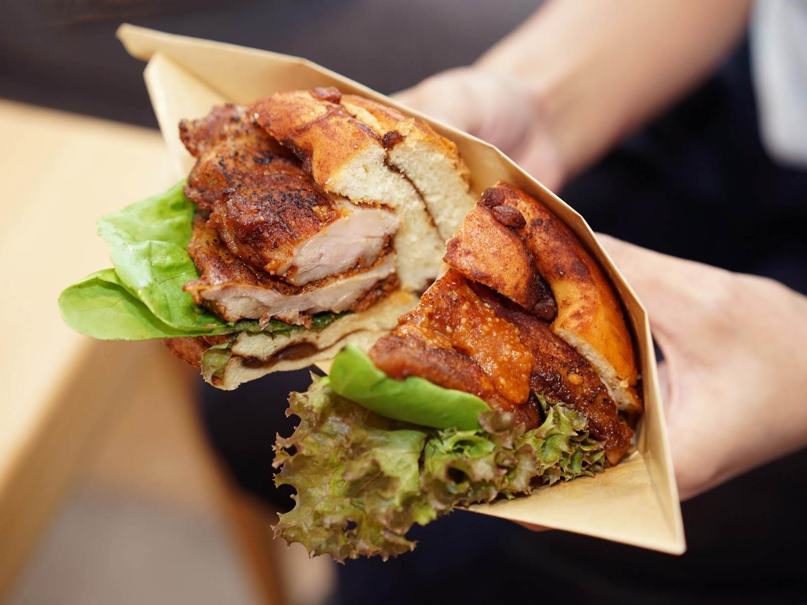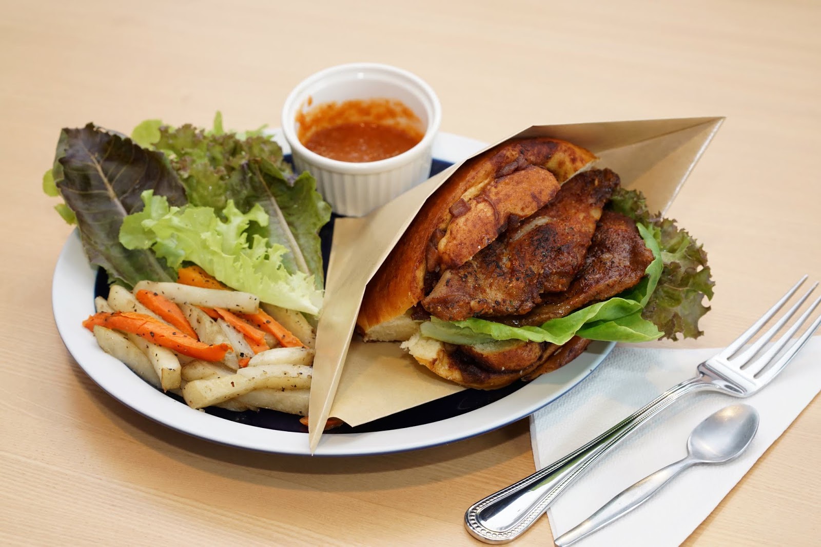 最近吉十咖啡又有新菜色,這次的新菜色是用蘋果肉桂捲夾烤香料雞腿排,再加上特選手摘生菜,搭配4款特製醬汁!滋味非常獨特,第一次吃到肉桂捲做的漢堡,加上厚實的雞腿排,吃起來相當過癮,滋味甜中帶鹹、烤香料雞腿排的小辣口感十分開胃!讓人一口接一口停不下來!