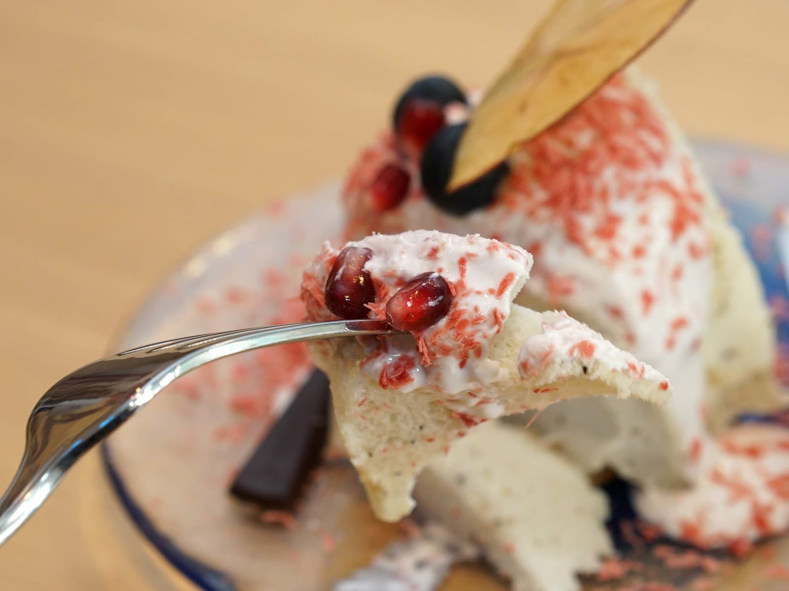 微甜微酸的口感很討喜,這一口吃到滑順的奶油與綿密的戚風蛋糕再加上石榴在口中迸開的果酸香甜,超好吃~