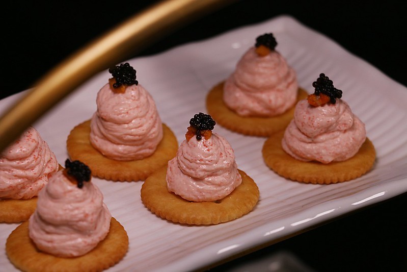 俄羅斯海膽魚子醬小點,以酥脆餅乾搭配明太子醬