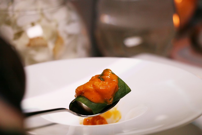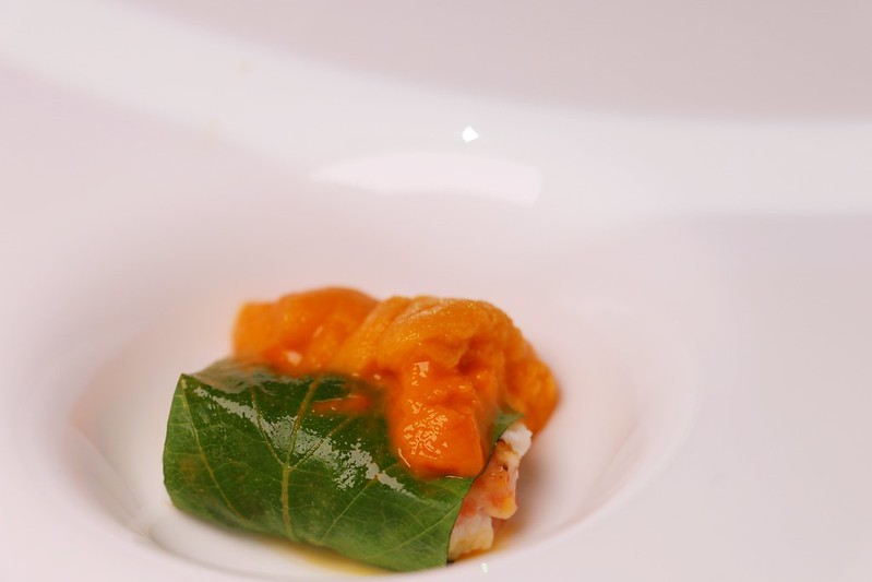 淋上適量橄欖油,以紫蘇葉包裹著,再用北海道海膽點綴