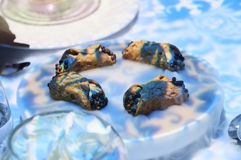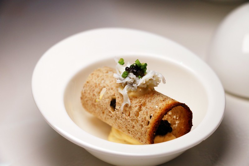 魚子醬搭配填入酸奶的自製麵包卷