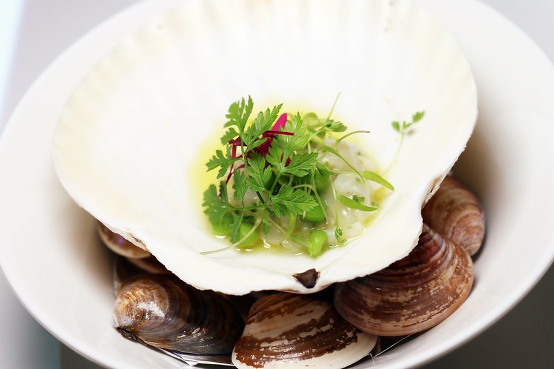 干貝塔塔,將北海道干貝,加入蝦夷蔥、橄欖油、檸檬汁