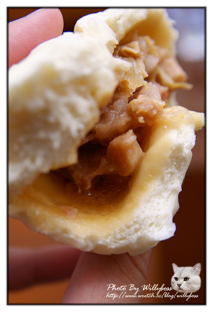 大口咬下!......奇怪,沒吃到料......再多咬幾口......吃了快1/3才看到肉餡 ,是看到不是吃到喔XD,經過實驗測試要一口就吃到肉必須一次咬大概將近1/2才辦的到,這個比例不太行啊~寧願包子做小一點感覺扎實,也比這樣打腫臉充胖子好些。