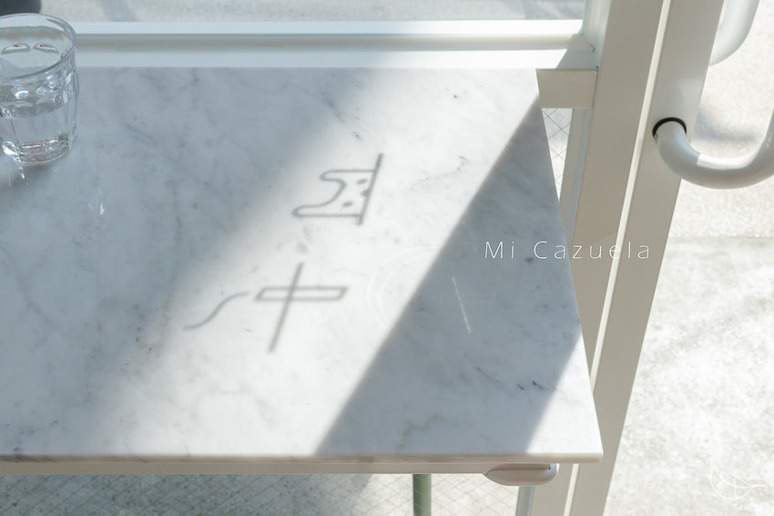 不過我特別喜歡這張大理石長桌,在那一天這樣好的天氣底下,藍天的分身帶著門上可愛的圖示光影反射,恣意地將一片天藍沾染上桌,彷彿將即將上桌的甜品們漂蕩滿天、沉浸其中。