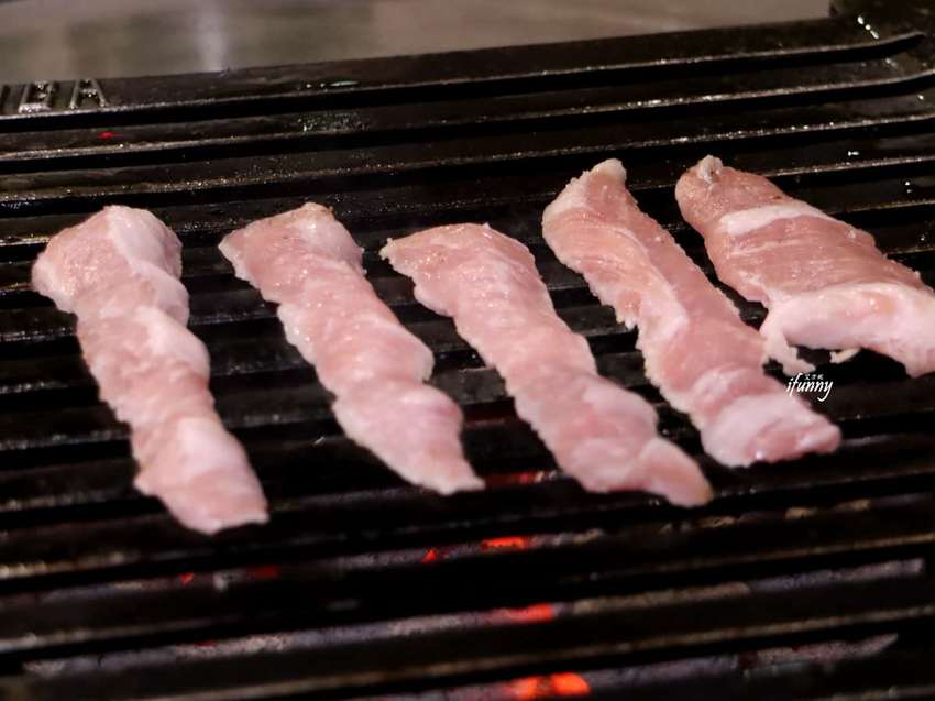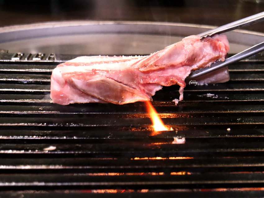 豬五花的油脂遇高溫化在炭火上,立即冒出了火花,這就是吃烤肉最大的樂趣啊!先來一場視覺、嗅覺及聽覺的享受!