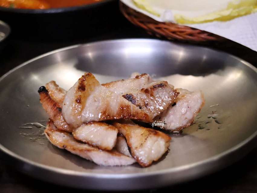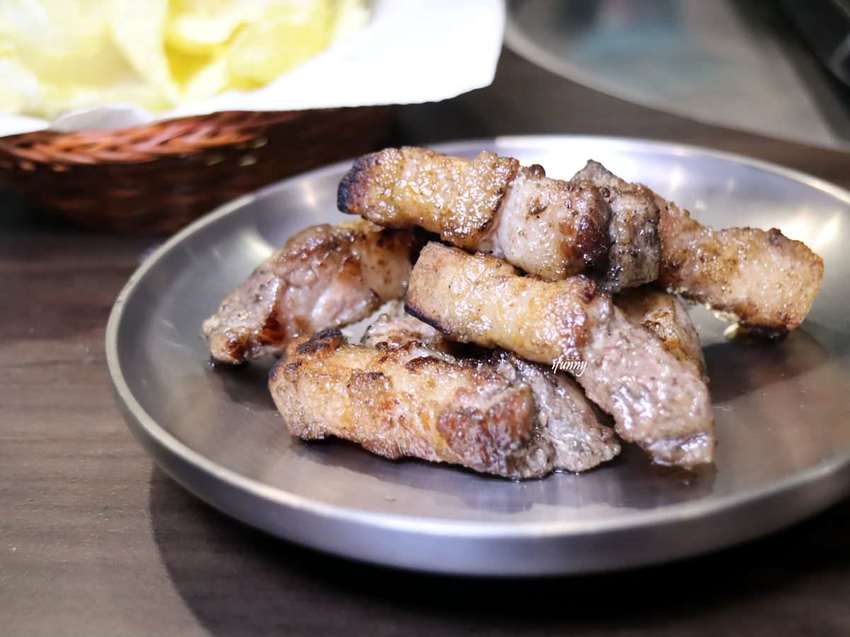 剪成條狀的五花肉,再把每一面烤至金黃上色就完成了喔!那豬五花烤過逼出油脂,入口後油脂都成了帶Q勁的口感,一點都沒有肥膩感,加上瘦肉的紮實感,每一口都帶著嚼勁,那油脂真的香得不得了!