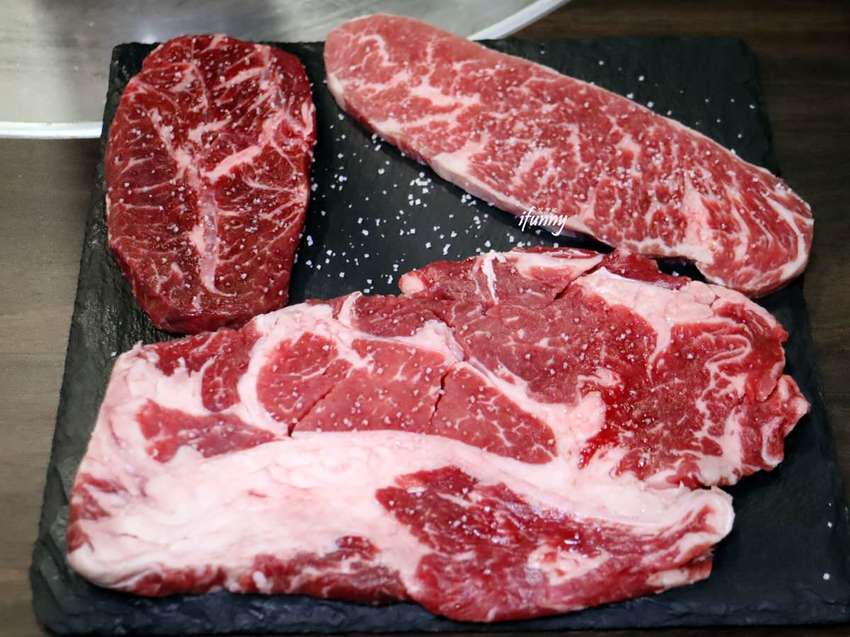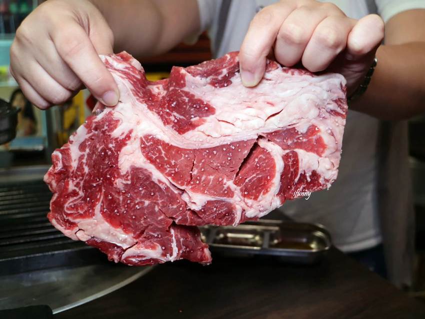這塊D肩胛肋眼大得誇張吧!而也看得出,這塊牛排在右上是佈滿油脂的,那個就是上蓋肉,也就是俗稱的老饕牛排。左下則是瘦肉較多,因此帥氣歐霸決定給我們不同部位的感受。