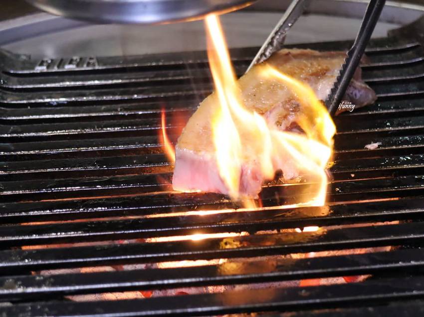 在火焰的熾烤之下,豬五花顯現出焦黃的色澤,真是太誘人了啦!