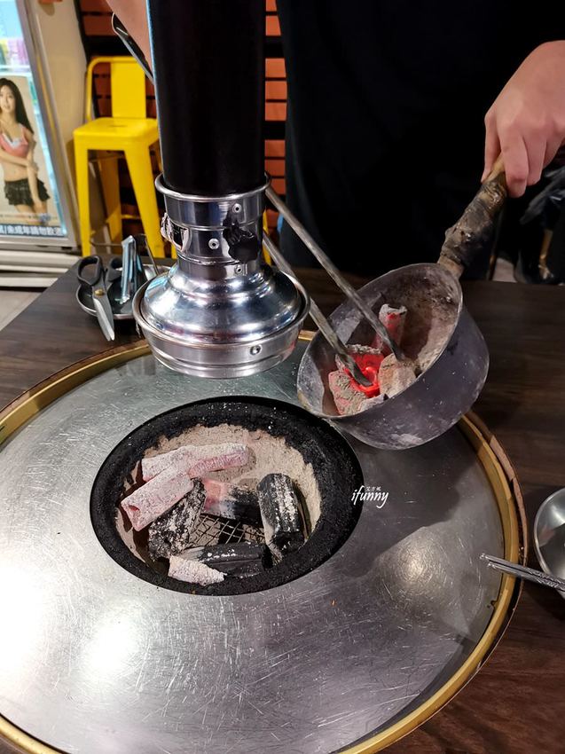 燒桶子採用的是炭火燒烤,等我們坐定後,才開始在我們的汽油桶上,加入了燒紅了的炭木。