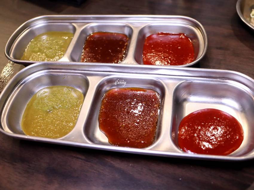 接著送上店家自製的沾醬,由左而右,分別是青蒜醬、梨汁醬以及韓式辣醬。