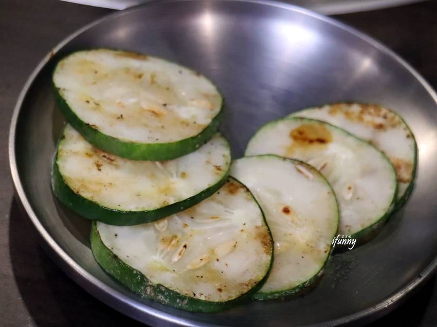 大黃瓜烤後,水份都包涵在其中,清新的水份解了口中的油膩感。