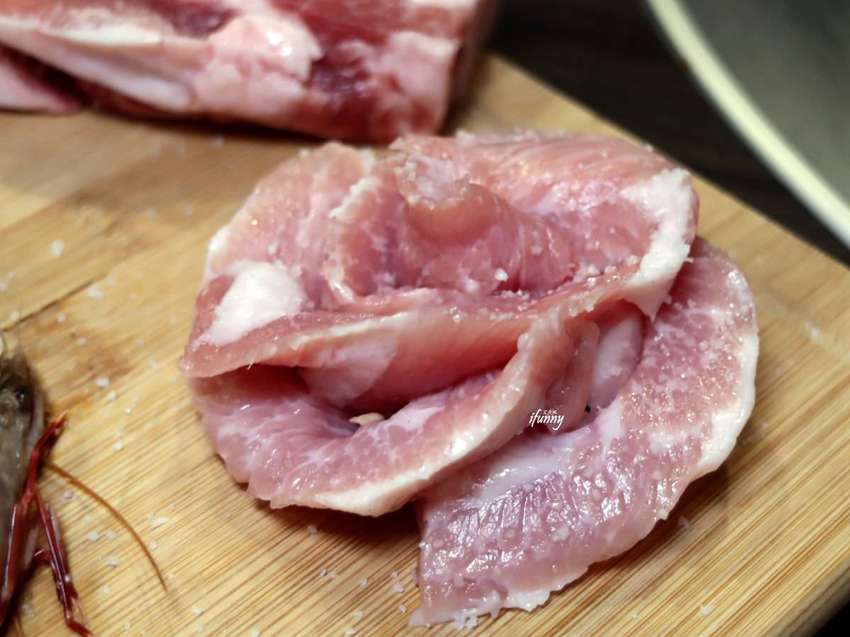 美麗的玫瑰花是由頂級黃金松阪豬所組成的。