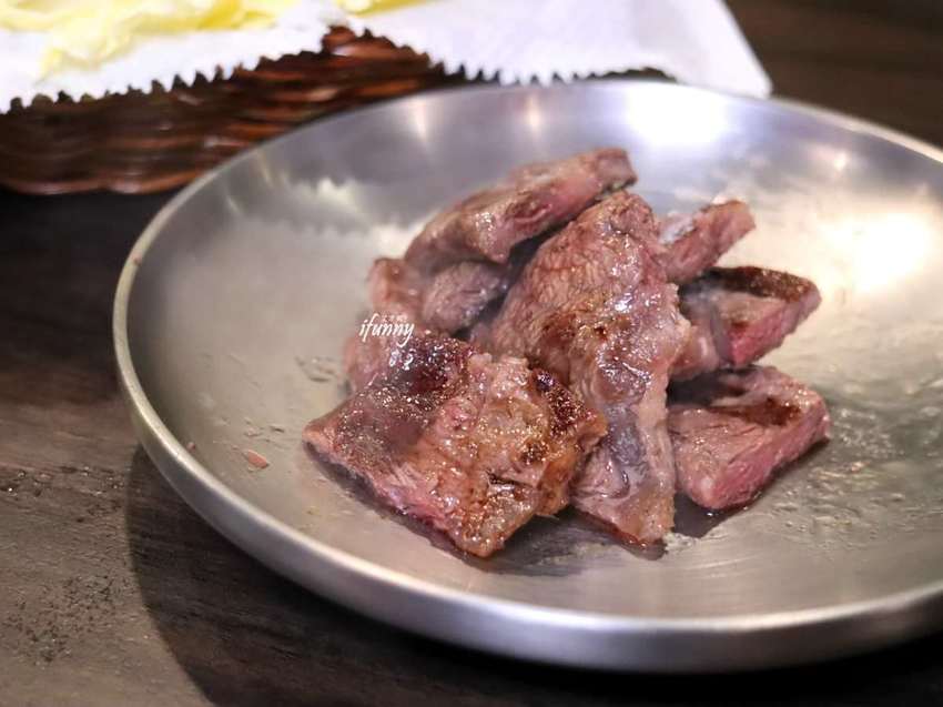 由於我們一直沈溺在大白菜夾肉的美味之中,整個錯過翼板牛排在烤盤上的過程,回過頭來已經烤熟在分剪了XDD
