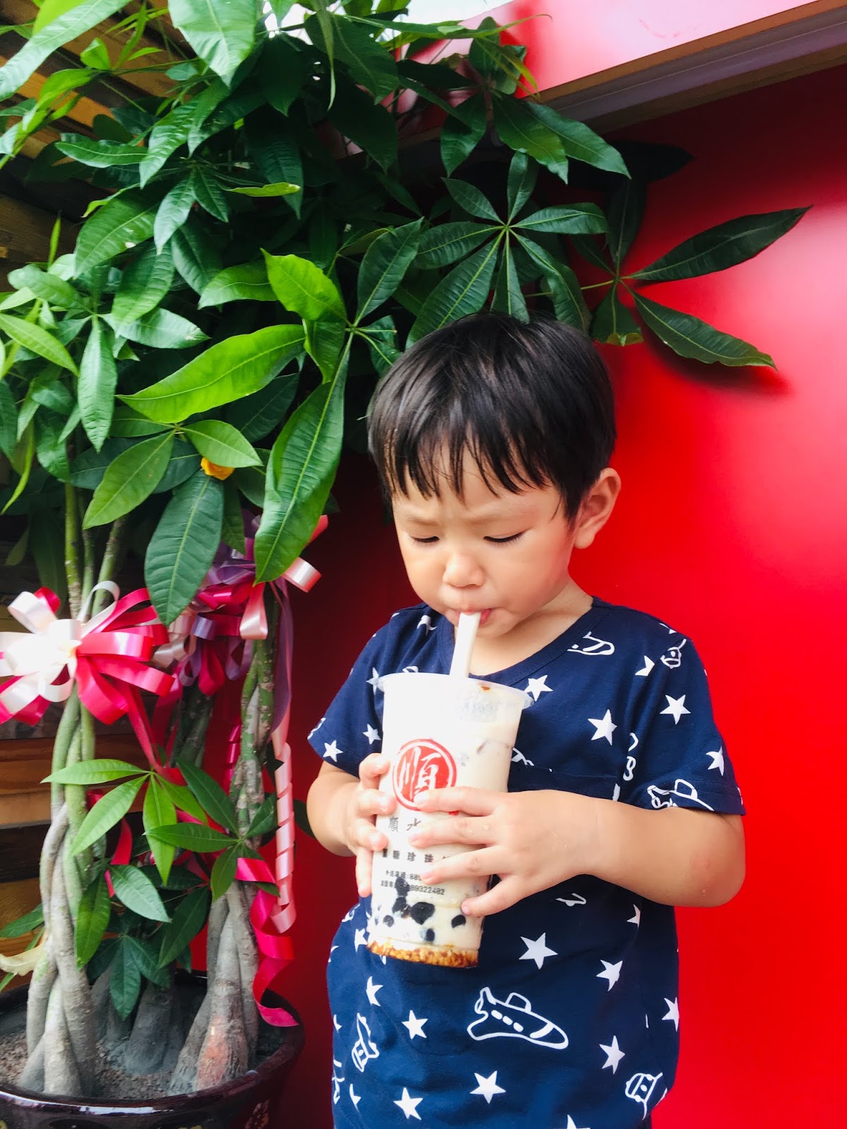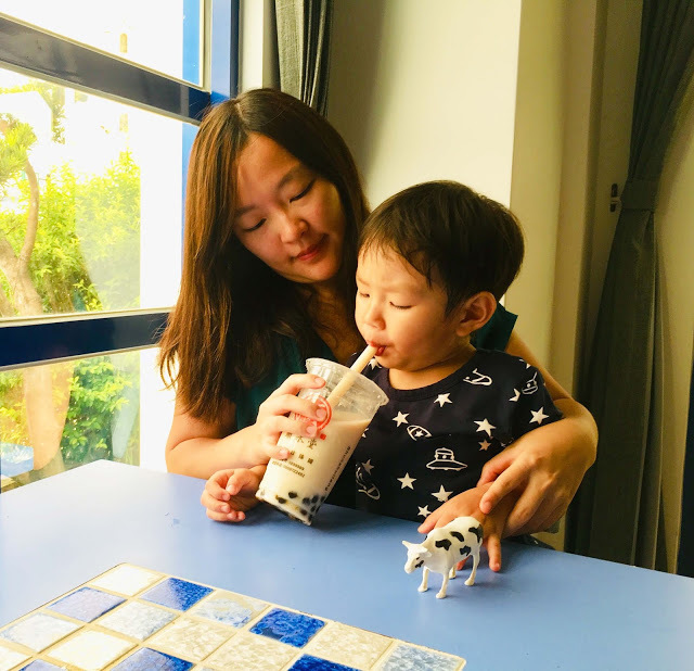 | 小福寶試喝一口黑糖波霸鮮奶 |