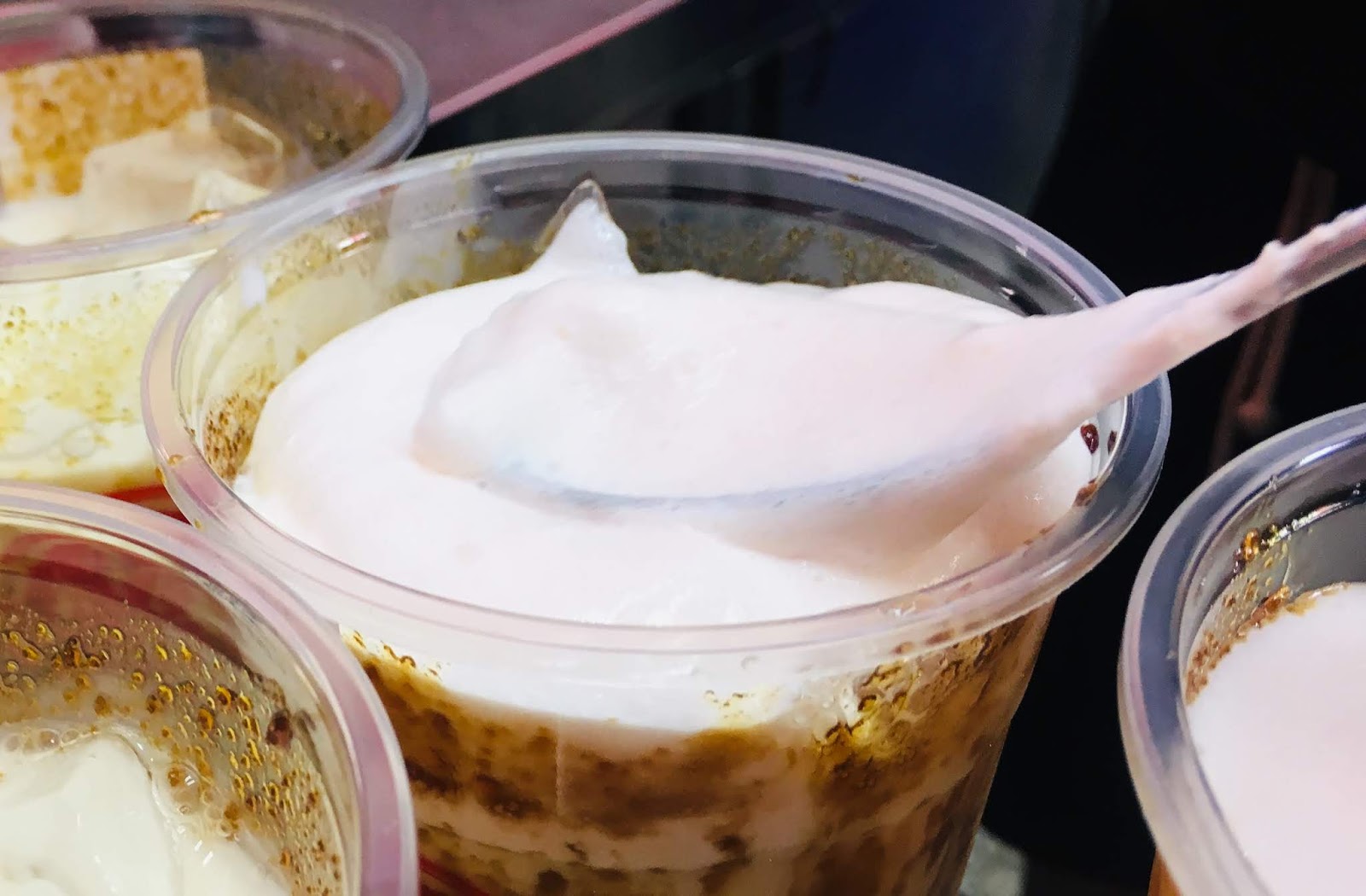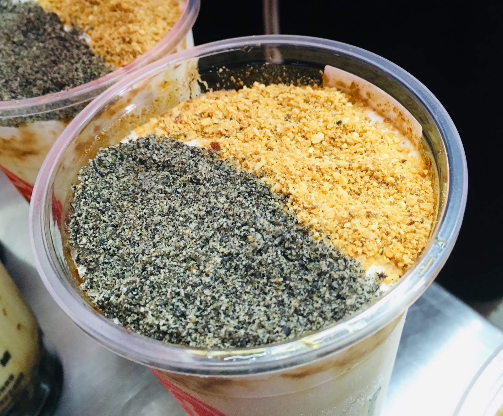 杯緣淋下的手炒黑糖,打造出澎湃的黑糖紋路,視覺效果相當誘人。我們以為這樣已經可以封蓋了,老闆娘說還有神秘配方要加。