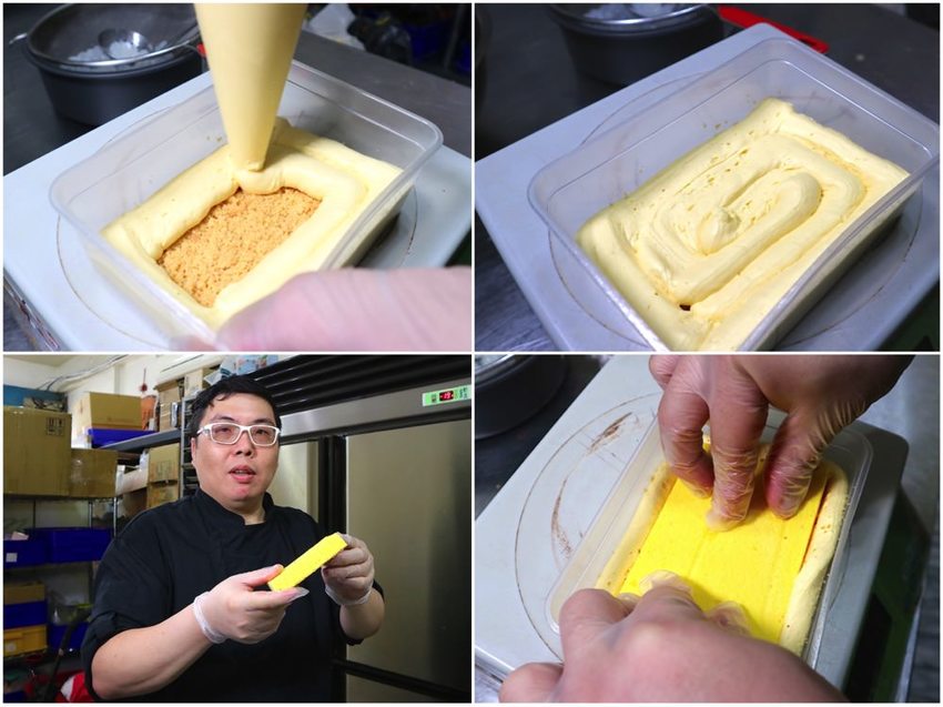 老闆從冷凍庫拿出蛋糕體,別小看這像菜瓜布一樣的蛋糕
