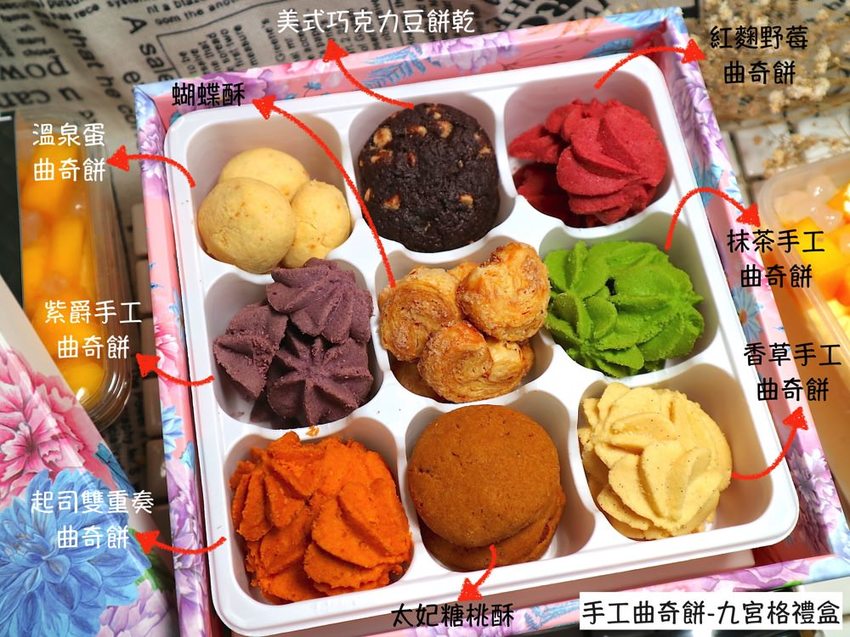 九宮格曲奇餅禮盒,也很不錯!一次能體驗到九種口味的手工曲奇餅,很適合還不知道自己最喜歡什麼口味餅乾的人唷~