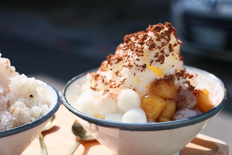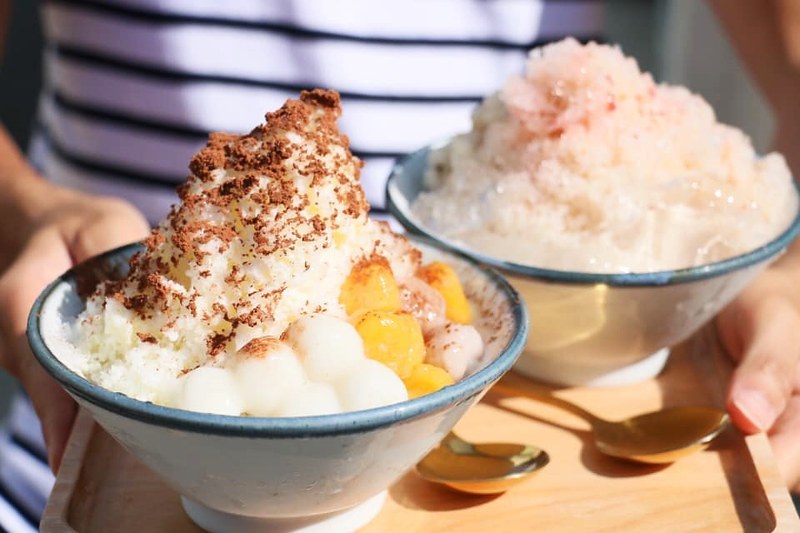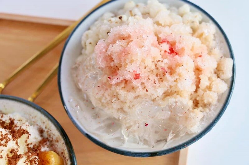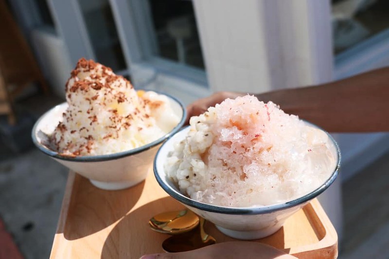 刨冰淋上自製玫瑰醬跟奶茶醬,味道清新不甜膩